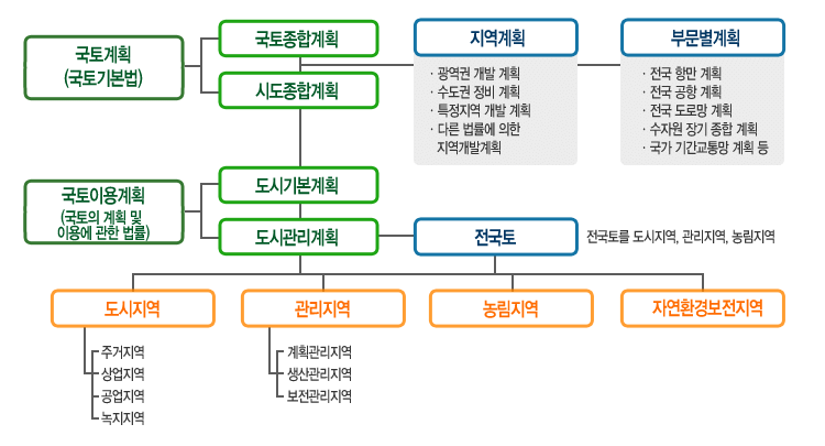 상위계획은 큰 맥락에서, 국토계획(국토기본법)으로부터 시작된다. 국토계획은 국토종합계획 – 시도종합계획으로 내려오며, 국토 전체 및 각 시도별 국토개발의 방향성을 제시한다. 물론 이 단계에서의 검토 사항이 개발에 실질적인 영향을 미치지는 않지만, 큰 맥락에서 같은 방향을 가지고 가야 한다.