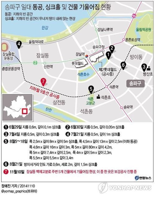 하지만 우리의 기대를 비웃기라도 하듯이 송파구 일대의 땅이 꺼지기 시작했다. `14년 6월 송파구청 인근 0.1m 지름의 싱크홀을 시작으로 일대에 동공(지하의 빈공간)과 싱크홀, 건물 기울어짐이 현상이 일어났다.