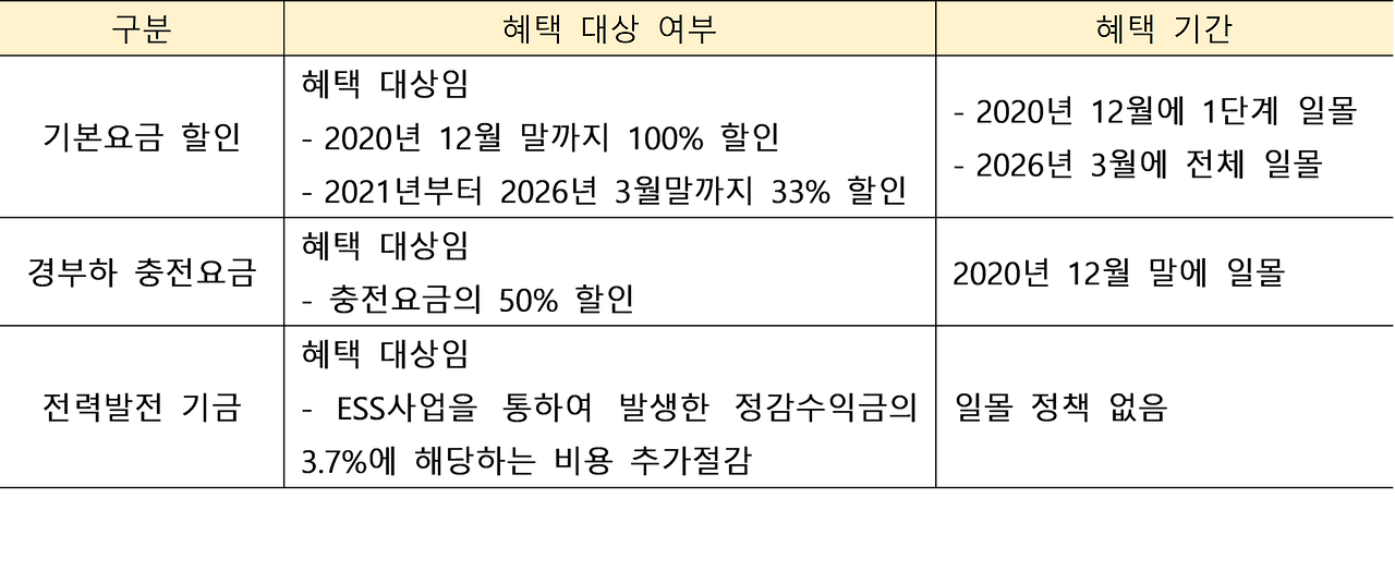 여기에 2017년 초 정부는 ESS 사용 확대를 위한 정책으로 전력 요금 별 ESS 특례요금제 혜택 제도를 발표하여 시행 중이므로, 경부하대 충전하는 요금에 대해 할인을 제공한다.