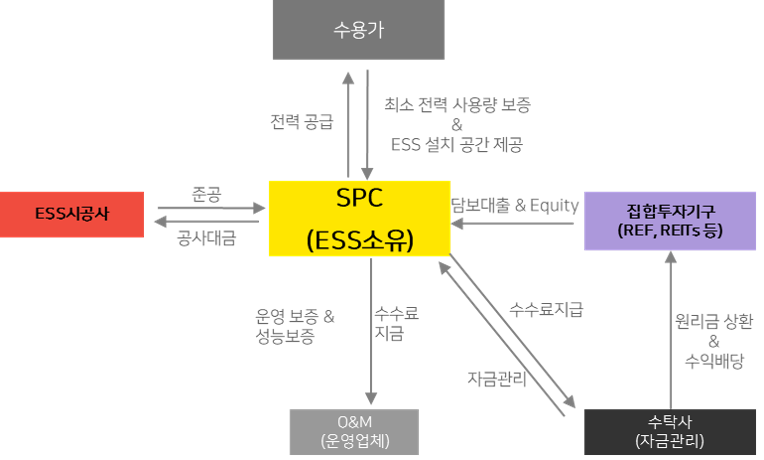 2)ESS펀드(집합투자기구): ESS펀드는 ESS로부터 발생하는 수익과 비용을 처리하고 사업 전반에 관여한다. 매분기 마다 해당 ESS로부터 발생한 수익에 대해 투자자에게 배당하고 펀드 수익률을 관리한다.