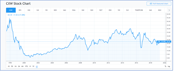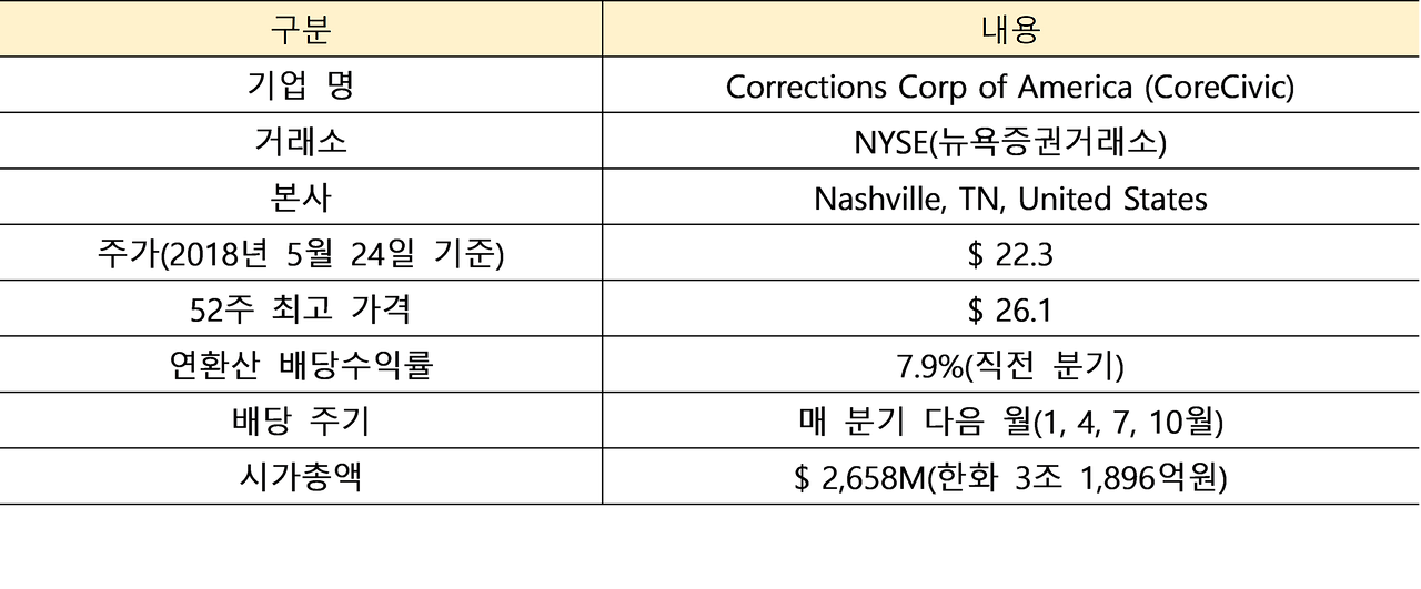 Corrections Corp of America (CoreCivic)은 뉴욕 증권 거래소에 상장된 있는 리츠다. 동사는 1983년에 설립되었으며, 14년 후인 1997년에 상장되어 현재까지 사업을 영위하고 있다. 미국 내 사설 감옥 업체 중 시장 점유율은 2위이며 2018년 기준 연간 $ 1,836M(한화 2조 2천억 규모)의 수익을 창출했다. 기업 개요는 아래와 같다.