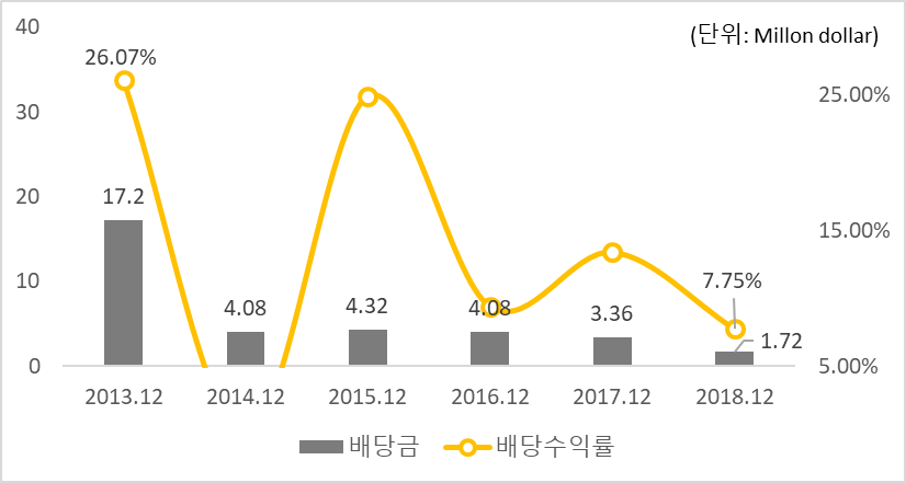 이와 더불어, 2018년 $121M 규모의 유형자산에 대한 자본적 지출이 있었는데, 이러한 영향에 따라 배당금이 감소한 것으로 보인다.