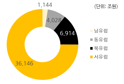 유럽 내 지역별로 살펴보면, 독일, 프랑스, 벨기에 등이 있는 서유럽이, 3.6조원으로 강세를 보였고 다소 국가 신용등급이 낮고 규모가 작은 체코나 폴란드 등이 속한 동유럽으로도 투자가 확산되고 있는 추세로 보인다.