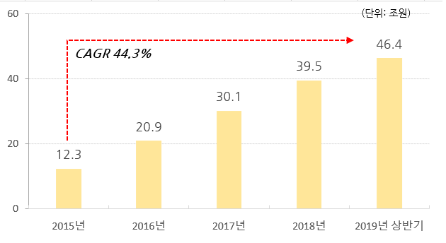 금융투자협회 해외부동산 펀드 설정 데이터를 보면, 2019년 상반기 누적 46.4조원을 달성하였으며, 최근 5개년간 해외부동산 펀드 투자 규모는 연평균 44.3%(2019년의 경우 연환산하여 성장률 산정)로 성장하였다.