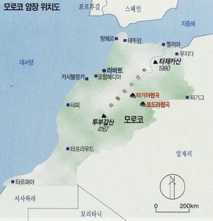 두 번째 등반지는 모로코 아틀라스산맥의 토드라 고지(Todra gorge)와 타기아 고지(Taghia gorge). 모로코는 지브롤터해협을 사이에 두고 유럽 이베리아반도와 저바고, 북쪽으로는 지중해, 북서쪽으로는 대서양, 동쪽과 남동쪽으로 알제리와 접경하며, 남서단은 서사하라와 국경을 접한다. 아틀라스산맥은 지중해와 대서양으로부터 사하라사막을 가로막고 솟아 있으며 아프리카 북서부의 모로코, 알제리, 튀니지에 걸쳐 동서로 뻗은 산맥으로, 길이는 약 2,400km다. 가장 높은 산은 4,167m의 투브칼산이다.
