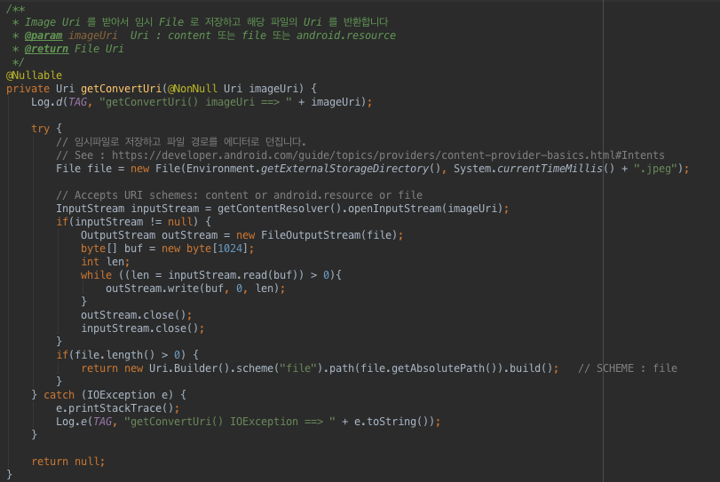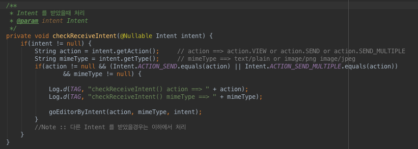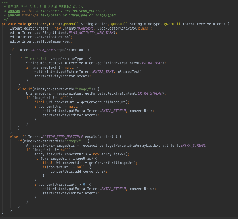 받은 Intent 가 멀쩡하면 다음과 같이 Uri를 이용해서 파일을 저장하고 에디터로 이동시킨다.