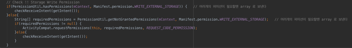 서두에서 이야기한 것과 같이 잠시 내 앱 저장소에 임시 파일로 저장해야 하기 때문에, Storage Write Permission을 체크하고 가야 한다.