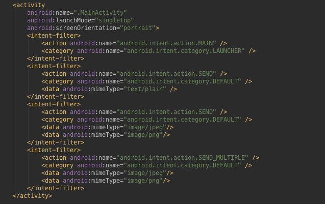 action SEND로 "text/plain"과 "image/jpeg" "image/png"를 받을 수 있도록 선언한다.