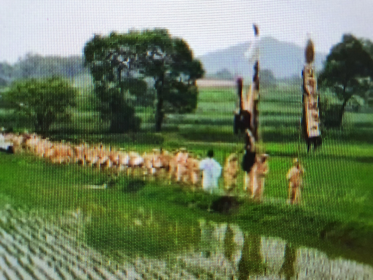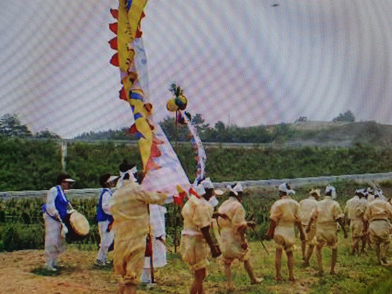 마을마다 농기의 형태는 다르겠지만, 우리 마을에는 굵은 대나무로 된 긴 장대(약 5~6미터 정도) 끝에 꿩의 깃을 보기 좋게 매달았다. 그리고 그 밑에는 태극기, 그리고 바로 밑에 농기가 달려있었다.