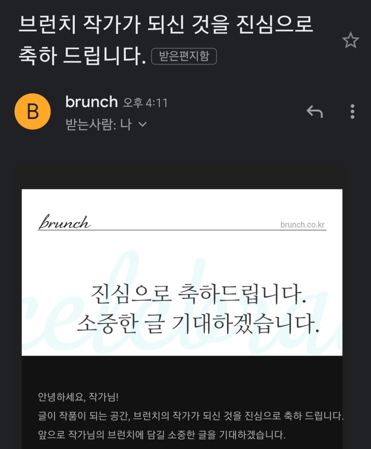 올해 개인적으로 가장 기뻤던 일 중에 하나가 브런치 작가로 선정된 일이다. 오래전부터 글쓰기를 하고 싶었는데 막상 시간이 없다는 핑계로 도전하지 못했었다. 브런치 작가에 선정되었다는 메일은 근래에 어떤 소식보다 가장 행복한 소식이었다. 나의 경험을 혼자 간직하지 않고 누군가에게 나누는 삶, 선한 영향력을 계속 이어가고 싶다.