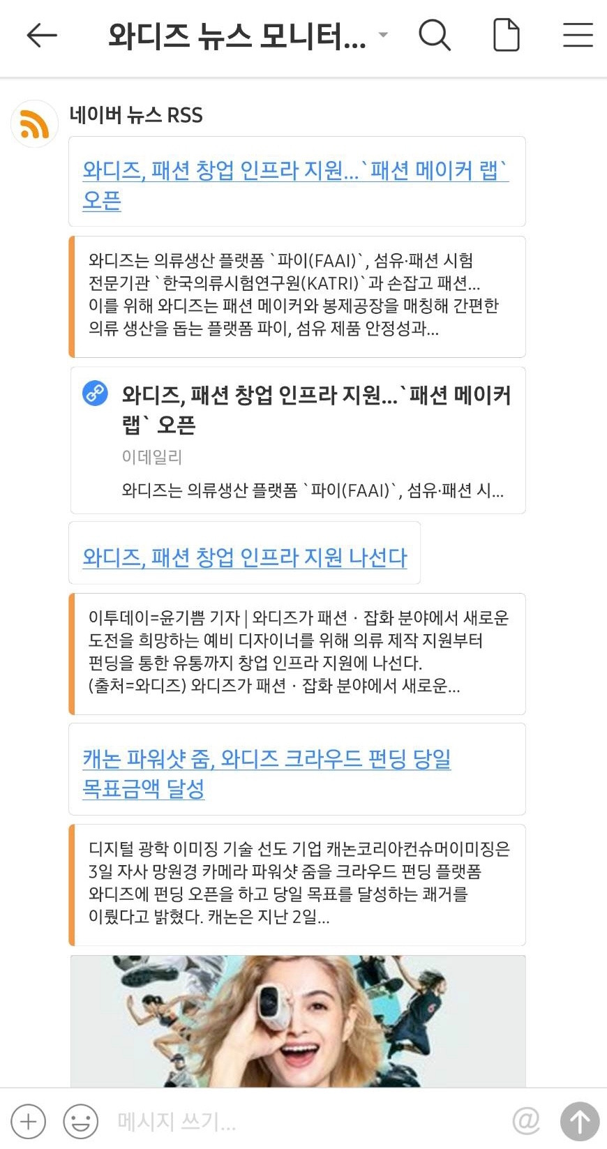 그러면 네이버 뉴스탭에서 수차례 회사명을 새로고침 하지 않아도 될테니 SOS를 날렸고, 능력자인 우리 동료는 사내 메신저 토픽(대화방)을 하나 개설하여 'RSS피드' 기능을 통해 우리 회사 키워드가 언급된 모든 뉴스를 대화방에 실시간으로 쏴주는 세팅을 해줬다.