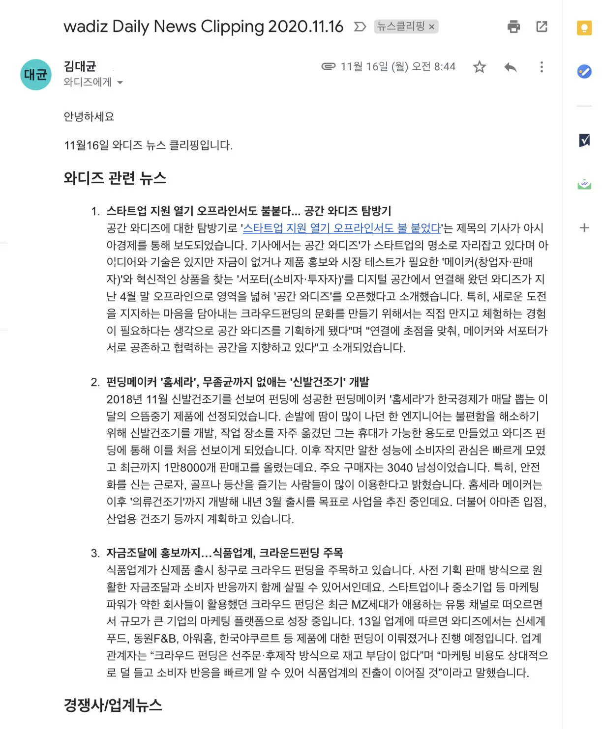 특히, 새로운 지원사업이나 정책 등은 기사를 통해서 가장 빨리 확인할 수 있으니 우리 회사가 신청해서 제공 받을 수 있는 혜택이나 정책 등은 뉴스 클리핑에 포함할 뿐만 아니라 HR이나 총무부서 등 유관 부서에 따로 전달해주는 센스까지 있다면 금상첨화겠다.