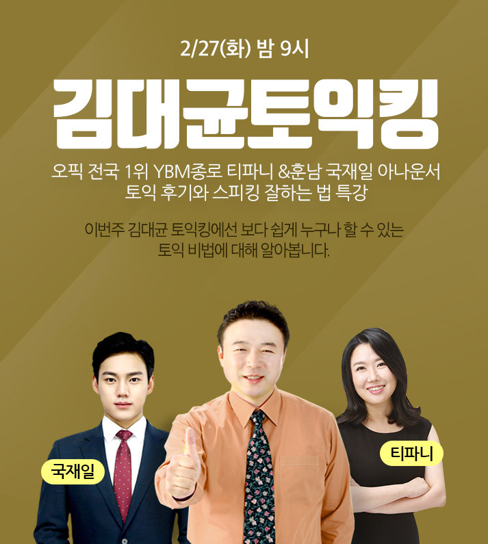 * 매주 화요일밤 9시 아프리카TV 김대균 토익킹 매주 호화게스트들을 모시고 진행중입니다.