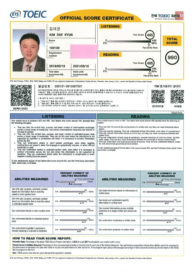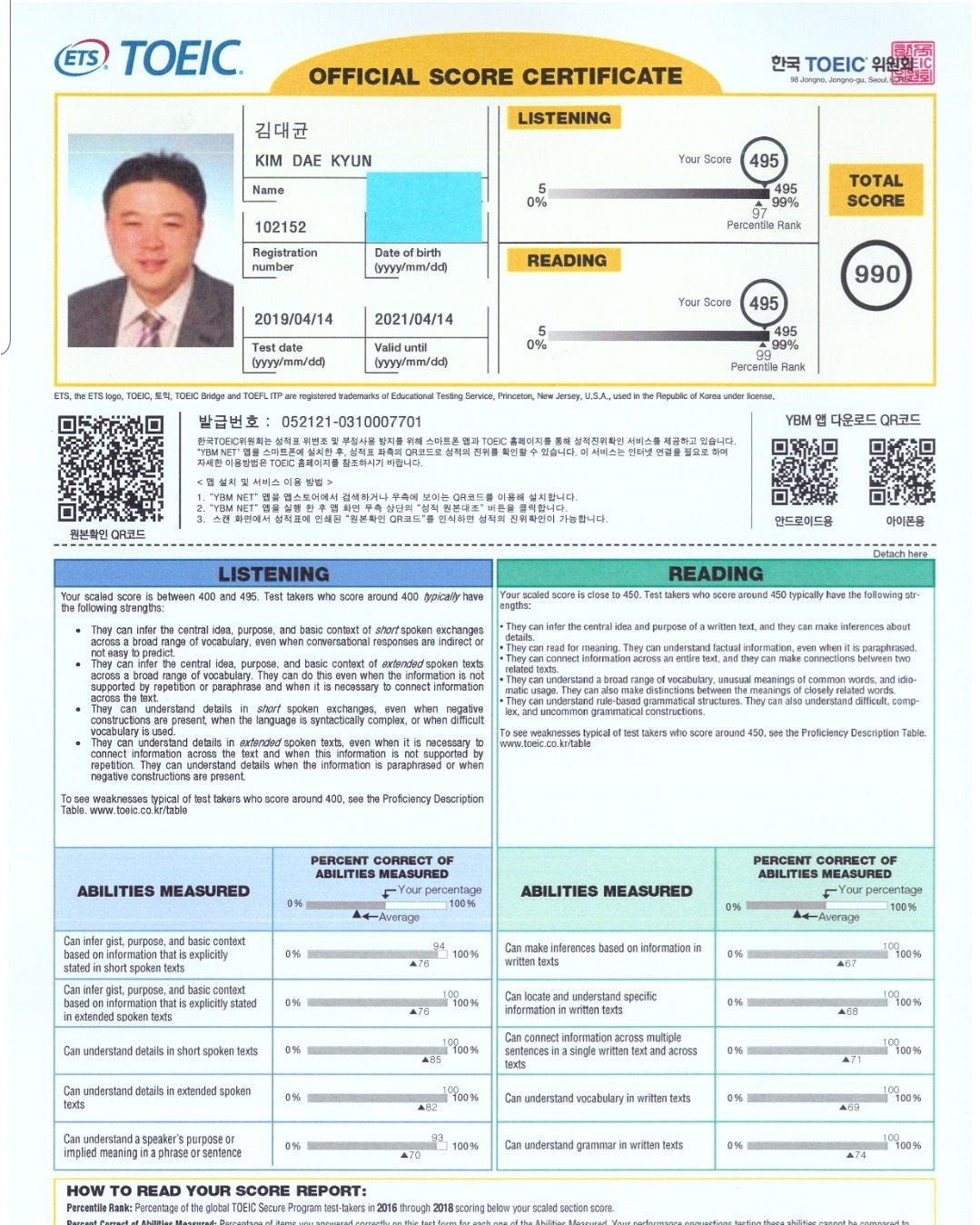 오늘 토익점수발표 김대균 4월14일토익도 990점 만점