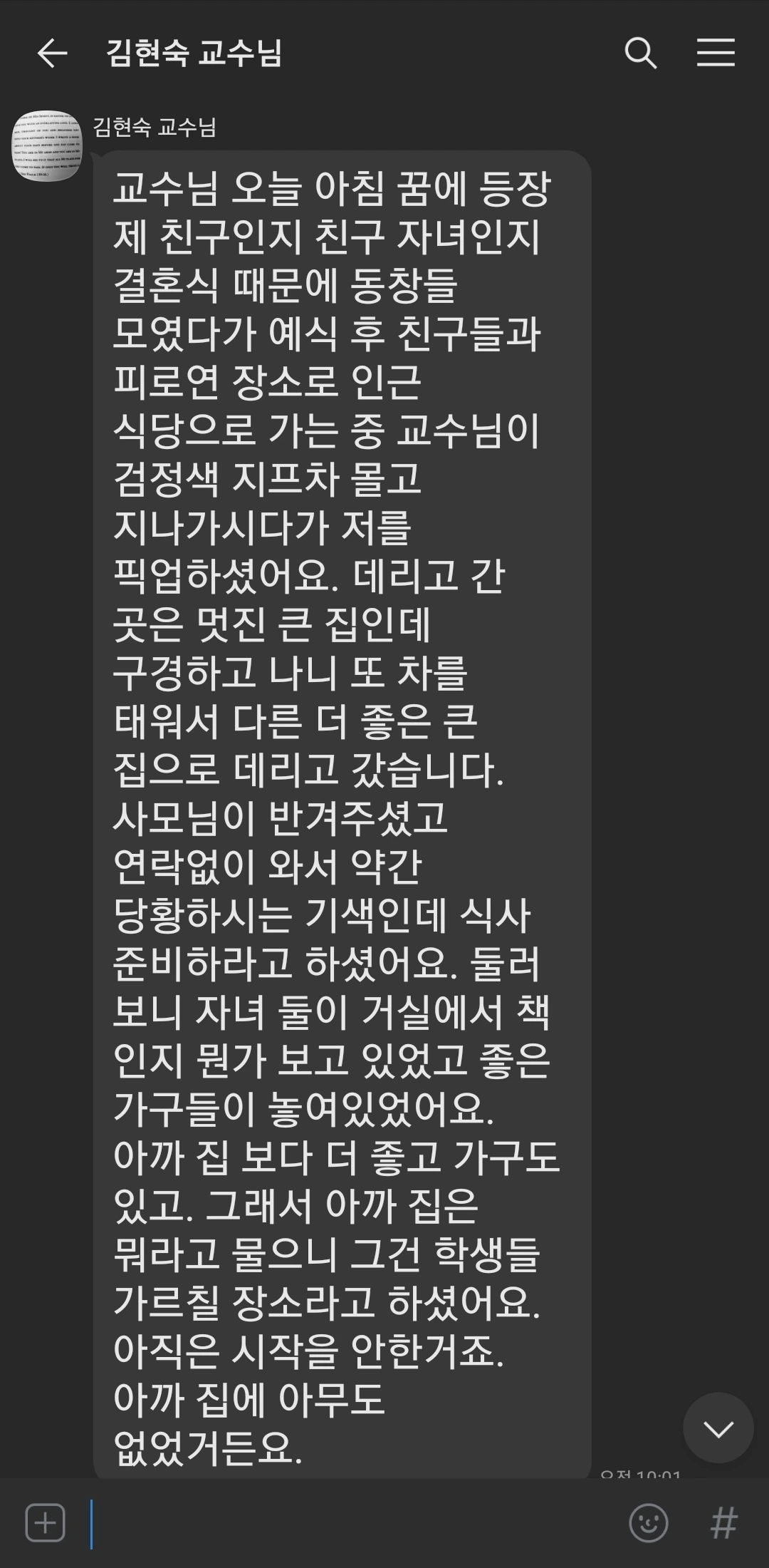교수님 오늘 아침 꿈에 등장 제 친구인지 친구 자녀인지 결혼식 때문에 동창들 모였다가 예식 후 친구들과 피로연 장소로 인근 식당으로 가는 중 교수님이 검정색 지프차 몰고 지나가시다가 저를 픽업하셨어요. 데리고 간 곳은 멋진 큰 집인데 구경하고 나니 또 차를 태워서 다른 더 좋은 큰 집으로 데리고 갔습니다. 사모님이 반겨주셨고 연락없이 와서 약간 당황하시는 기색인데 식사 준비하라고 하셨어요. 둘러 보니 자녀 둘이 거실에서 책 인지 뭔가 보고 있었고 좋은 가구들이 놓여있었어요. 아까 집 보다 더 좋고 가구도 있고. 그래서 아까 집은 뭐라고 물으니 그건 학생들 가르칠 장소라고 하셨어요. 아직은 시작을 안한거죠. 아까 집에 아무도 없었거든요.