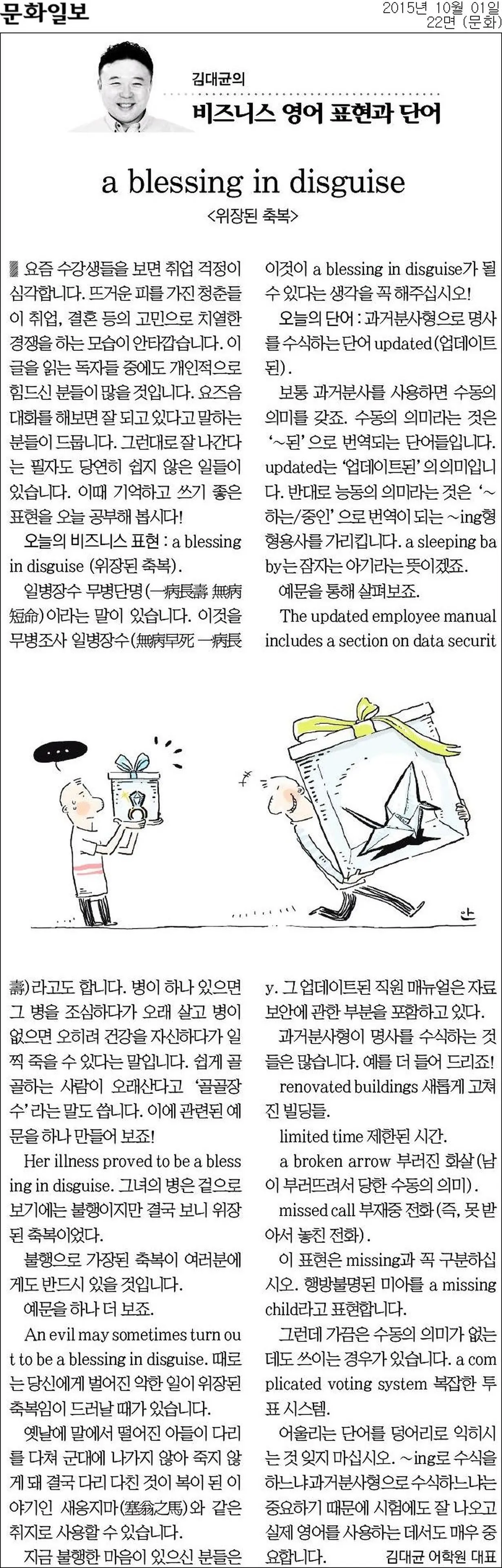 오늘자 김대균 비즈니스 영어 문화일보 연재입니다! 힘드시죠? 힘내시길!♡