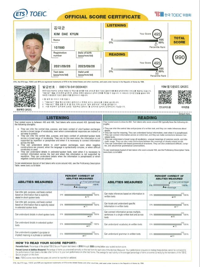 김대균토익킹이 받은 토익만점 성적표 분석! 클릭!