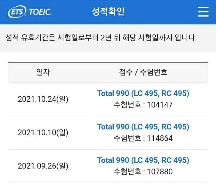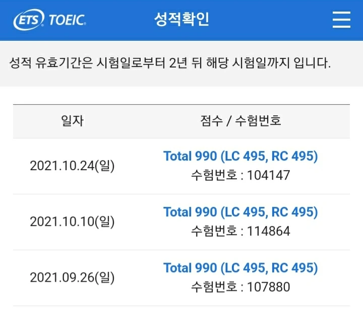 이번에도 토익만점 연속만점 김대균토익킹 그래마킹 토익성적표