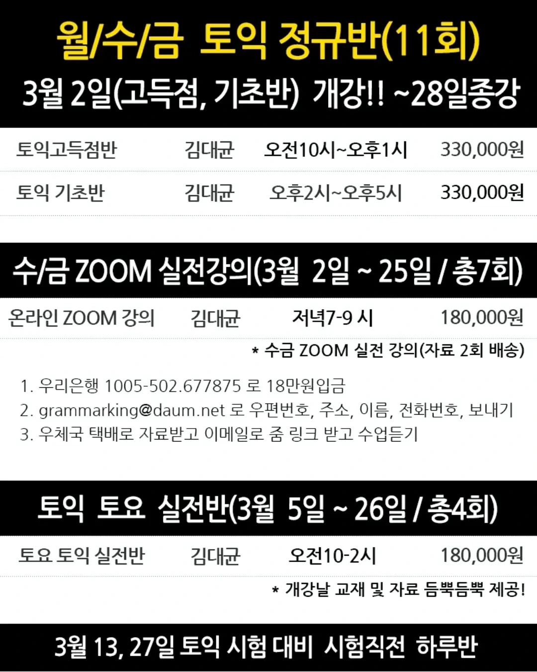 강남토익학원 삼성동 김대균어학원 3월시간표