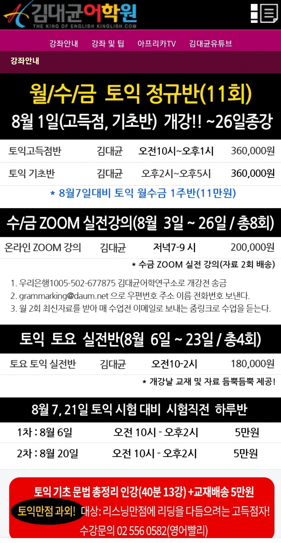 서울토익학원 강남토익학원 삼성동 김대균어학원 8월 시간표