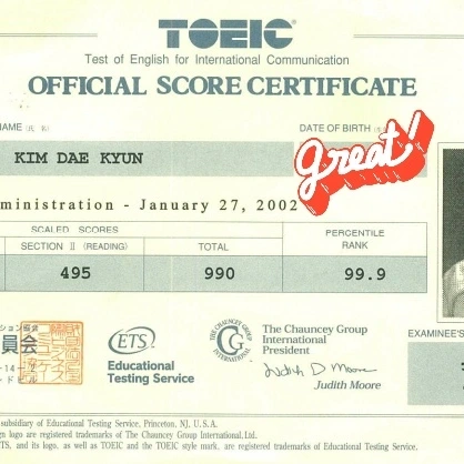 희귀자료. 2002년 1월 김대균의 일본토익만점 성적표 어느 마케팅 전문가의 컨설팅을 받은 적이 있다. 성공적인 마케팅은 숫자를 제시하는 것이 좋다고 하고 희귀한 자신만의 것을 보여줘야 한다
