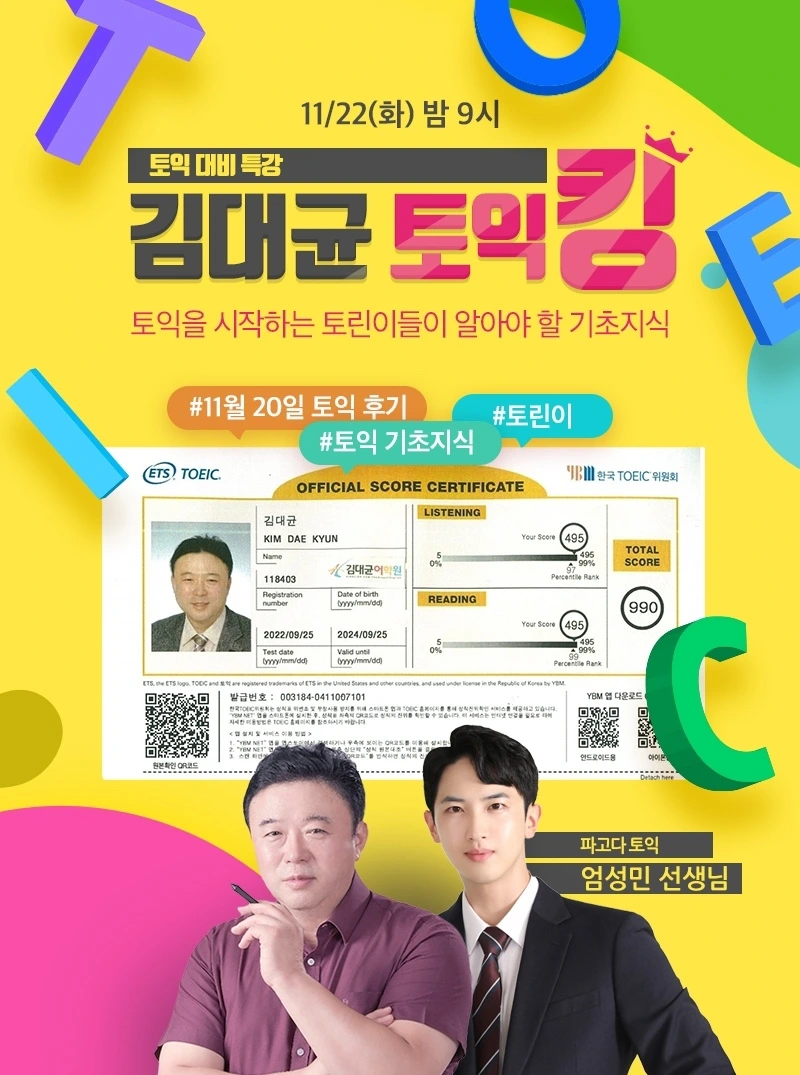 실시간1위 김대균토익킹 그래마킹 11월20일토익후기 라이브 방송 다시보기 클릭!