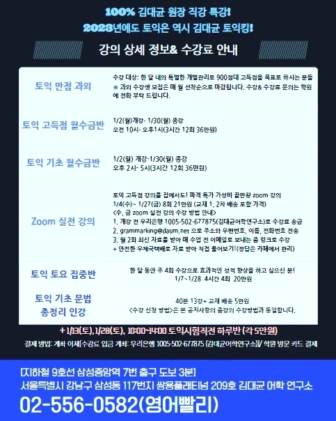 김대균어학원 월수금반 10-1시 실전반, 2-5시 기초반