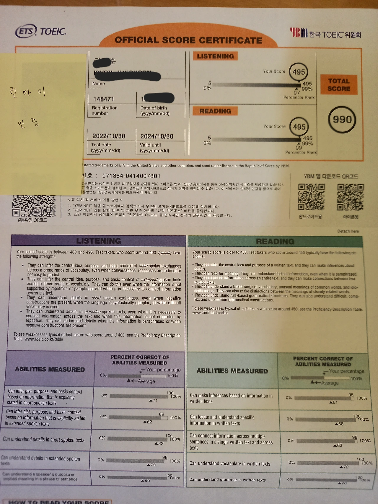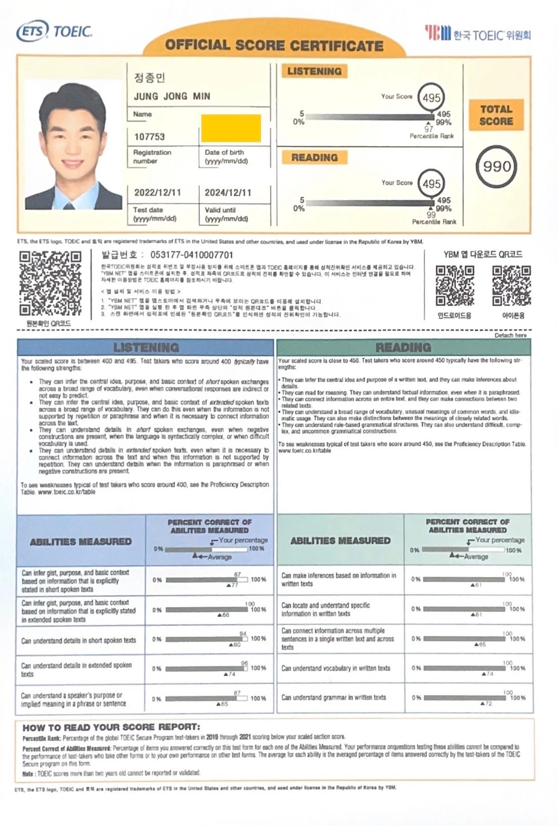 김대균토익킹 수강생 정종민군 토익 990점 만점!