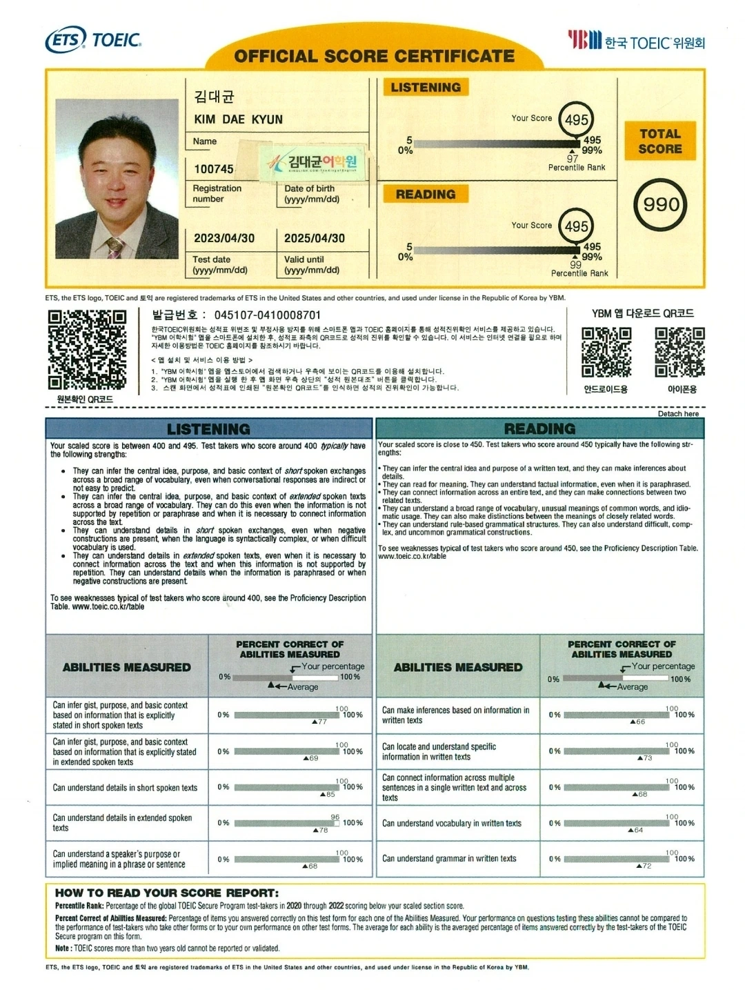 토익 최다응시 최다만점강사 김대균토익킹 성적표들