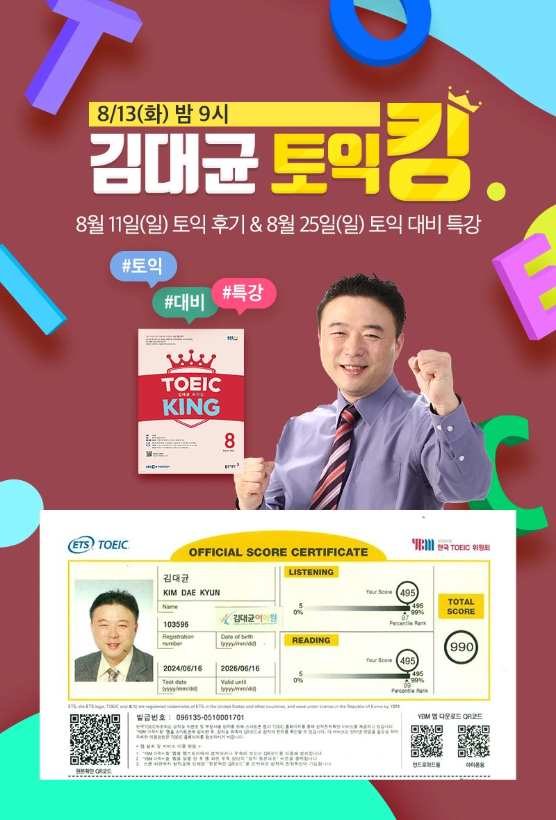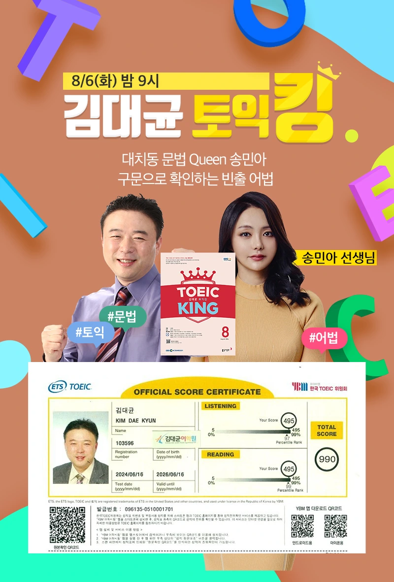 Dae Kyun Kim의 브런치입니다. 토익 최다응시 만점강사 김대균 김대균 영문법 김대균 맛집 김대균어학원 원장