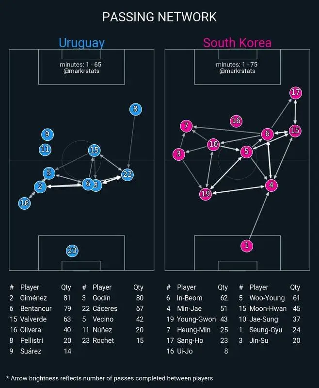 우루과이전 양 팀의 패스맵. 트위터 @markstatsbot