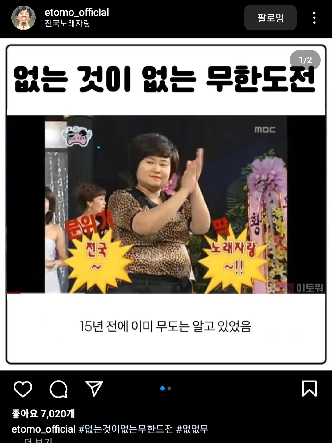 <이상한 변호사 우영우>의 대사(기러기 토마토 스위스)나 넷플릭스 화제작 <수리남>의 대사(밥 잡솼사? 7x8, 8x7)가 그대로 언급된 자막부터 전국노래자랑 사회자로 희극인 김신영 씨의 캐스팅을 예견한 듯한장면까지, 현 상황에 찰떡인 과거 장면들이 소환될 때마다 사람들은 기분 좋은 추억에 잠긴다. 우스갯소리로 무한도전이 미래를 예측한 것 아니냐며 '무도미나티'라는 예능계 신조어까지 생겨났다.