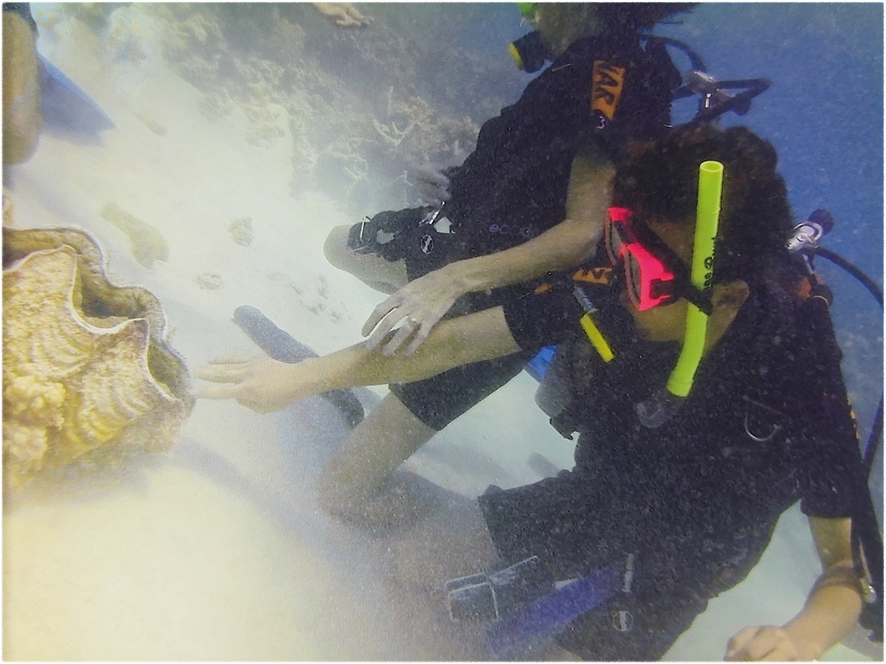 가이드가 코스대로 이동을 한다. 최종 목적지에는 대왕 조개가 있었는데, 만져보라는 사인을 받았다. 정말 내 몸통만 한 조개가 살짝 만졌는데 쿵! 하고 입을 닫아 버리는 것 같았다. 너무 신기해서 막 즐거워하는데 갑자기 3명 중 1명이 물 위로 갑자기 올라가는 것이었다.