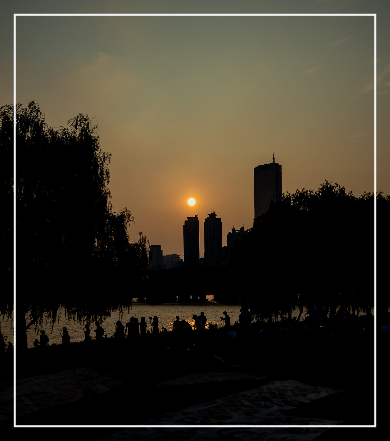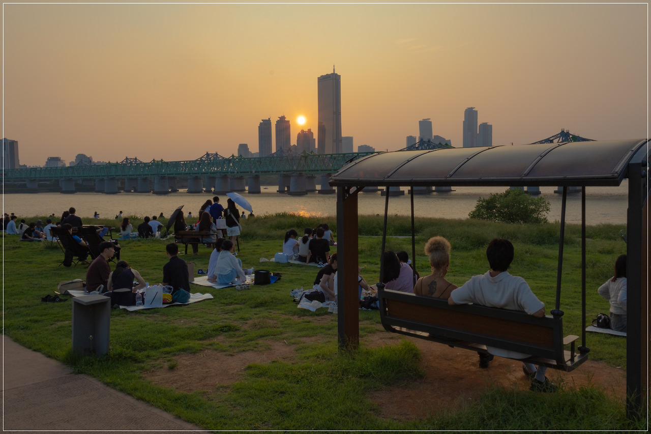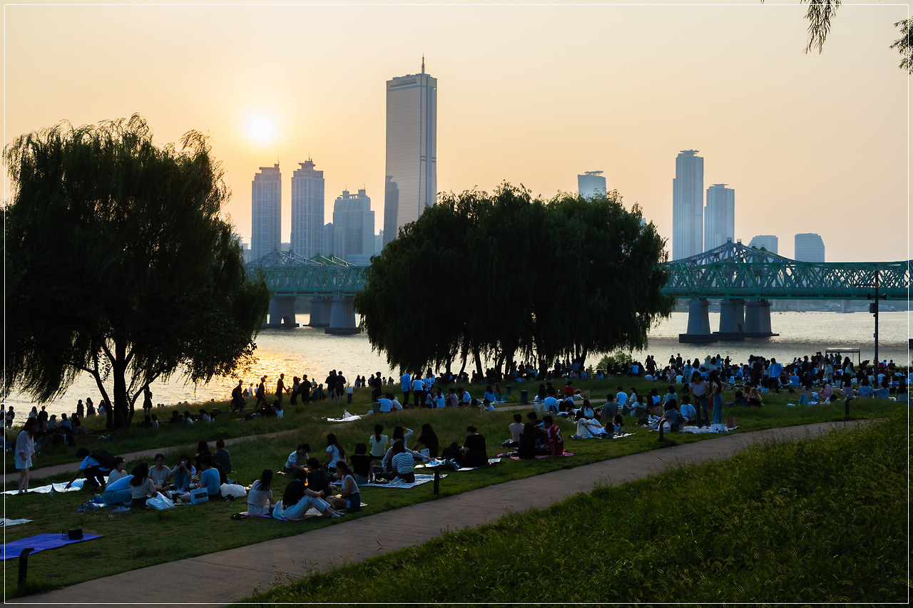 해가지던 한강 방향으로 돗자리의 사람들의 풍경이 아늑함을 준다.