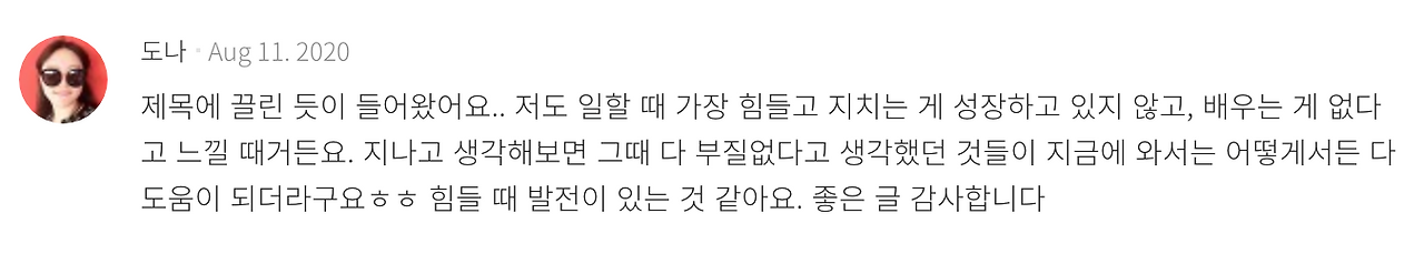 블로그에 글을 쓸 때도 그랬듯 항상 부족한 내 글을 읽어주시는 분들께 감사하다. 취미로 글을 쓰고 있지만 정말 좋은 글을 쓰는 사람이 되고 싶다. 누군가가 내 글을 읽었을 때 공감하고, 위로가 될 수 있는 그런 좋은 글. 얼마 전 나의 브런치 첫 댓글을 달아주신 닉네임 '도나'님. 좋은 글 감사한다는 피드백에 기분이 너무 좋아 잠도 안 왔다. 제가 더 감사합니다!