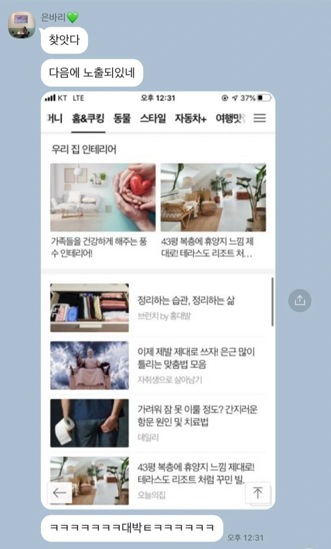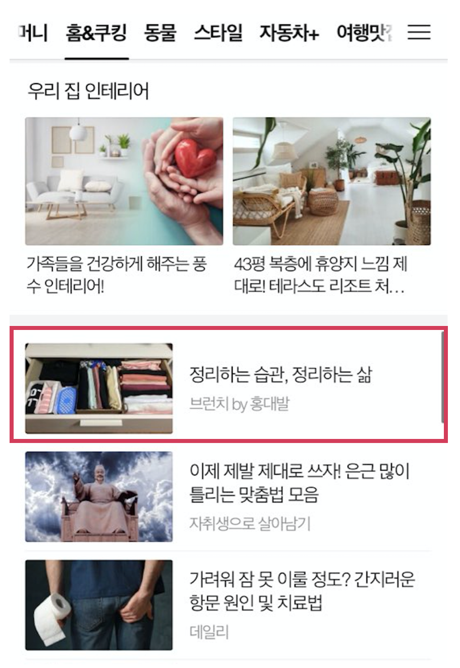 무슨 일인가 싶었다. 어제 글 하나를 쓰고 자긴 했는데. 갑자기 조회수가 왜 이러나. 와이프에게 바로 카톡 메시지를 보냈다. 서치를 잘하는 와이프는 금세 내 글이 노출된 곳을 찾아서 나에게 보내줬다. 포털사이트 다음의 홈&쿠킹에 내 브런치 글이 노출된 것. 왜 내 글이 실렸는지 얼떨떨했지만, 계속 오르는 조회수에 내 기분도 업됐다.