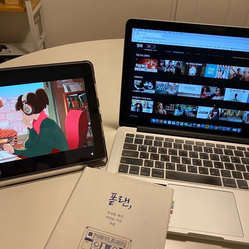 다이닝룸이 생겨 신난 우리는 일단 거실 청소는 뒤로한 채 기쁨의 맥주를 들이켰다. 분위기를 더해줄 넷플릭스까지. 전셋집이어서 인테리어를 하고 싶은 욕구를 항상 참아왔는데 크게 손대지 않고 가구 배치만으로도 기분 전환하는 효과를 얻을 수 있었다. 서재에 있던 짐들은 꼭 필요한 것들만 두고 모두 버렸다. 이제 서재는 다이닝룸이자 내 작업실이 되었다.