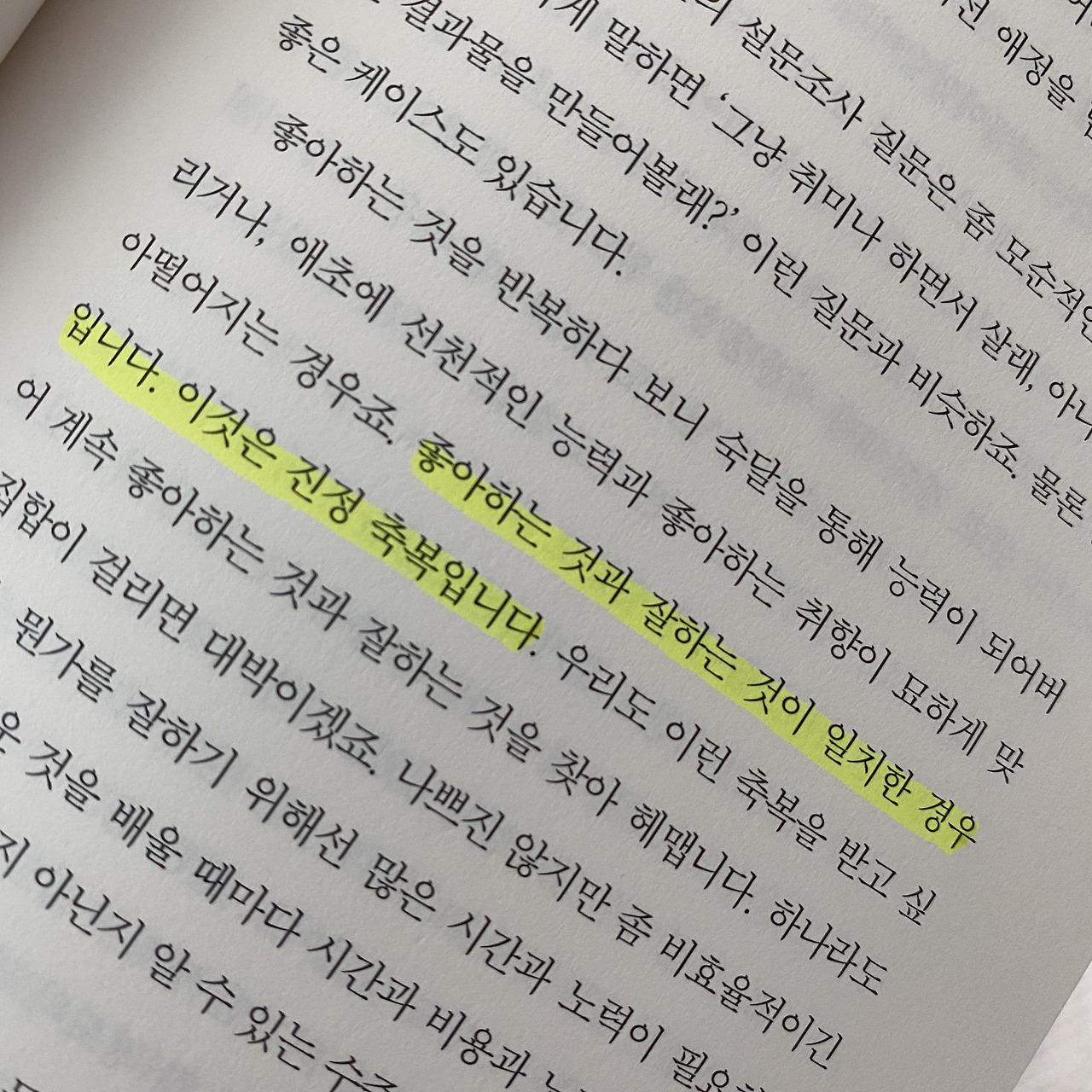'일'을 즐겁게 한다면 정말 좋겠지만, 일에서 재미를 느끼기란 쉽지 않다. 적성에 맞는 일을 한다는 것은 정말 최고의 행운이다. 일이라는 건 힘들지만, 그래도 일을 '잘'하기 위해 노력하게 되는 원동력은 '내가 성장하고 있다는 느낌을 받을 때'가 아닐까.