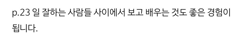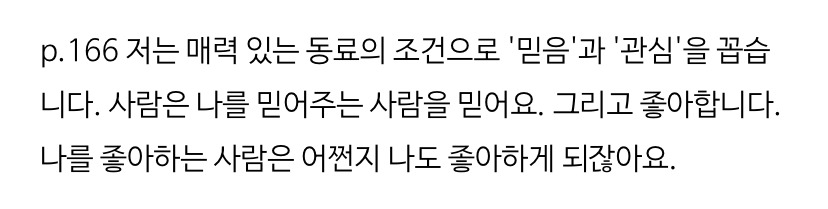 우리 팀원들의 장점은 더 많지만 간략히 정리(자랑)해봤다. 끝으로 내가 일하는데 지침서로 삼고 있는 <마케터의 일>이란 책에 동료에 대한 좋은 문장들이 있다. 아래 문구들을 다시 보면서 동료를 진심으로 생각하고 ‘믿음’과 ‘관심’을 주는 내가 되어야겠다고 되새겨 본다.