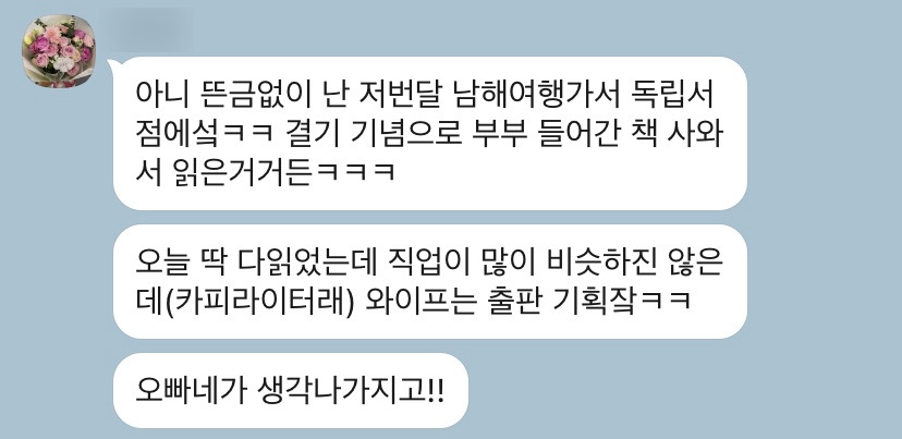 책 한 권을 읽었는데 우리 부부가 생각났다는 동기. '오잉?' 난 일하다가 카톡을 급하게 봤던지라 조금 놀랐지만 이내 반가움과 고마움에 바로 답장을 했다. 그리고 놀라움이 가시고 난 후에 책을 읽고 나와 내 아내가 생각났다고 말해준 것에 대해 큰 감동이 밀려왔다.(크흑.. 눈물이)