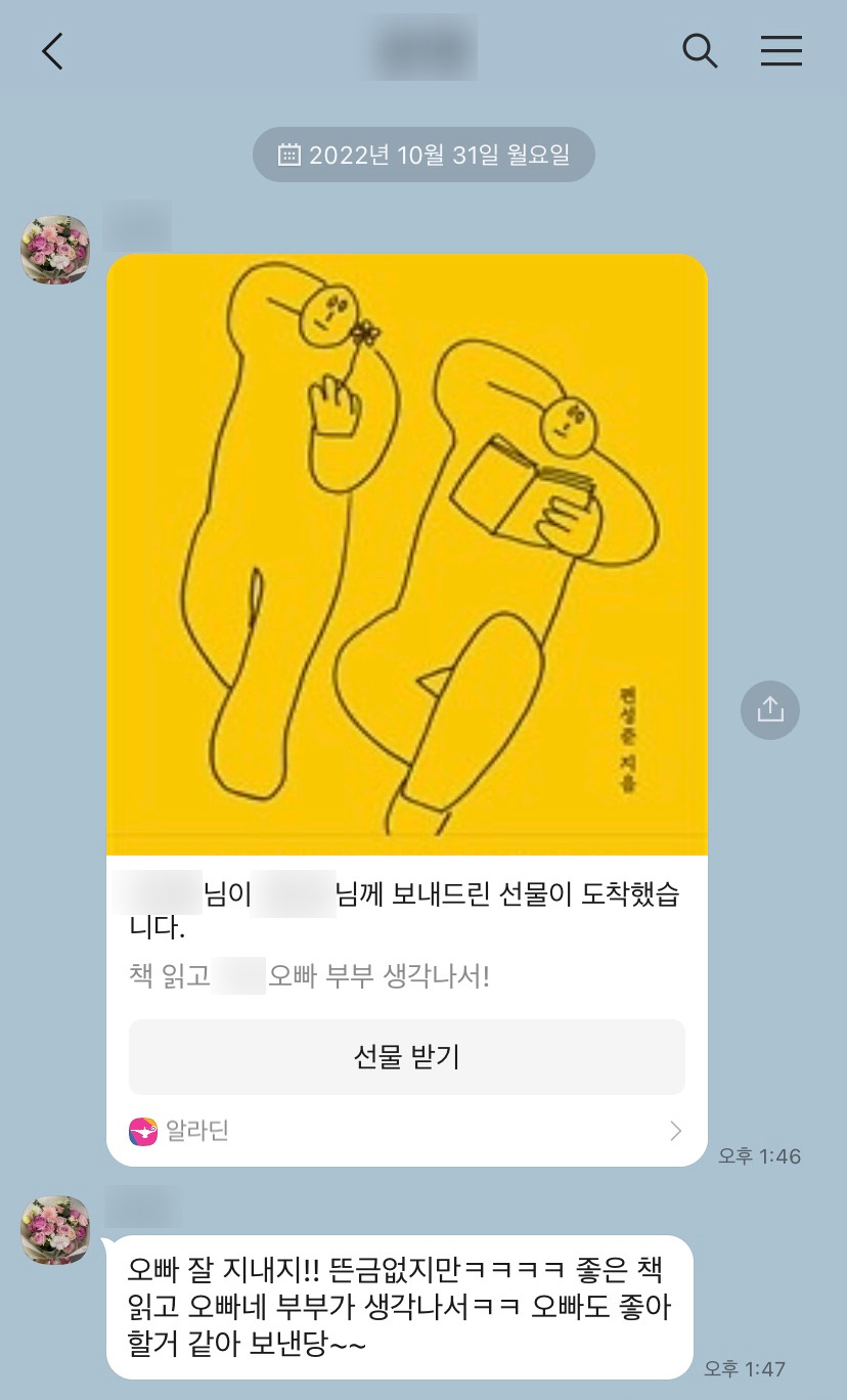 오랜만에 대학교 동기에게 연락이 왔다. 둘 다 졸업 후 열심히 사회생활을 하고 있고 각자 결혼도 하면서 연락한 지가 꽤 되었는데 카카오톡으로 '책 선물'을 하며 반가운 연락이 왔다. 그 반가웠던 메시지는 아래와 같다.