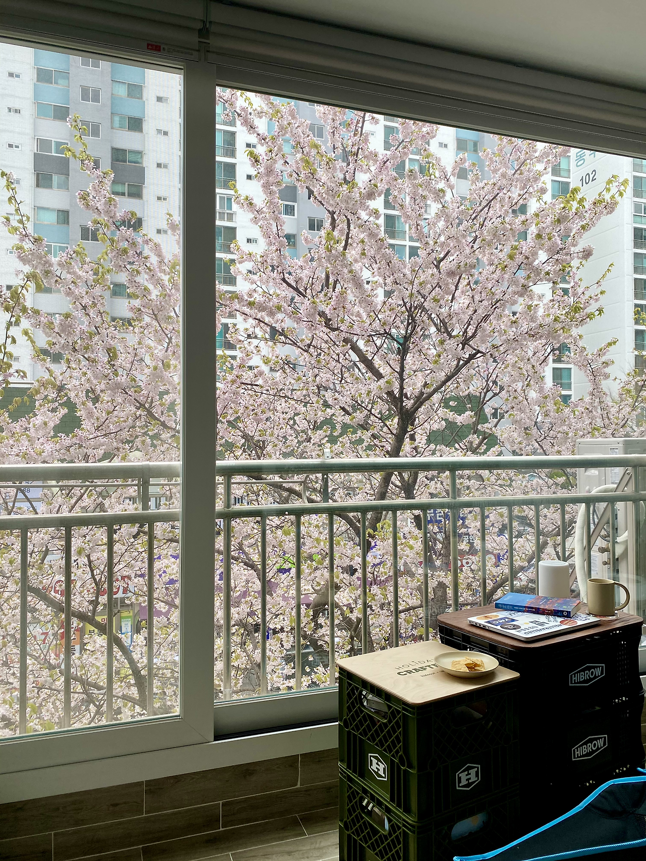 봄이 되면 베란다 앞으로 벚꽃이 활짝 핀다. 아주 감동스러운 뷰다. 봄에는 아침에 일어나면 항상 베란다로 향하곤 했다. 작년에는 벚꽃이 완전 만개했는데, 올해에는 작년보다 좀 덜 피긴 했지만 그래도 너무 예뻤다. 봄에 햇볕이 좋을 때면 베란다에 앉아 커피를 마시며 이 벚꽃들을 구경했다. 벚꽃이 필 때도, 바람에 흩날려 떨어질 때의 장면도 모두 감동스럽다.