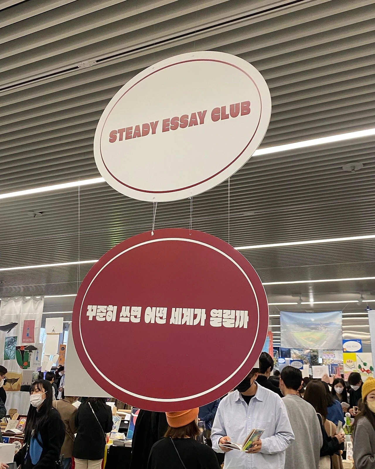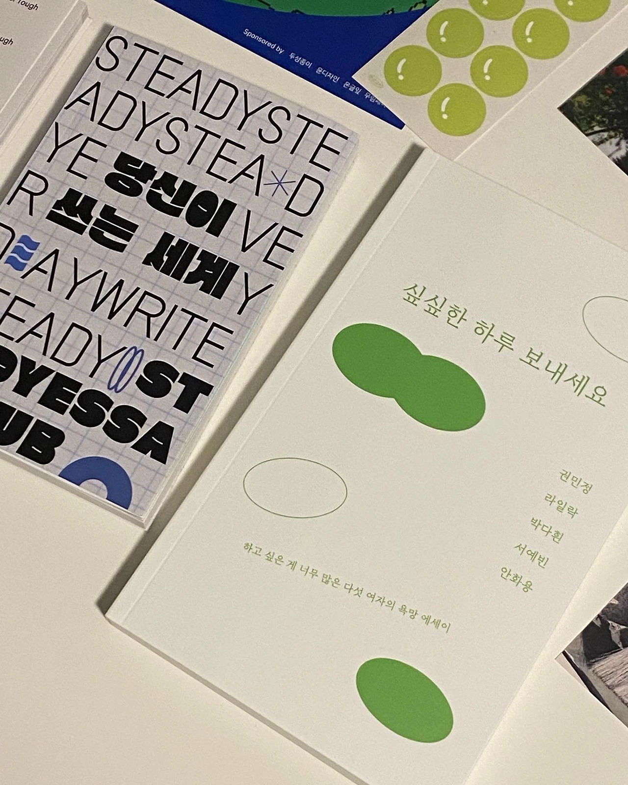 테이블을 계속 돌며 고심 끝에 두 권의 책을 구매했다. 싶하보의 <싶싶한 하루 보내세요>, 스테디 에세이 클럽의 <당신이 쓰는 세계, 스테디 에세이 클럽> 내용이 궁금해서 구매한 게 첫 번째 이유지만, 이 두 권의 책이 딱 내가 만들고 싶은 디자인과 사이즈의 책이어서 레퍼런스 삼을 겸 구매했다. 아직 다 읽어보진 못했지만 초반만 봤음에도 재밌음에 틀림없다.