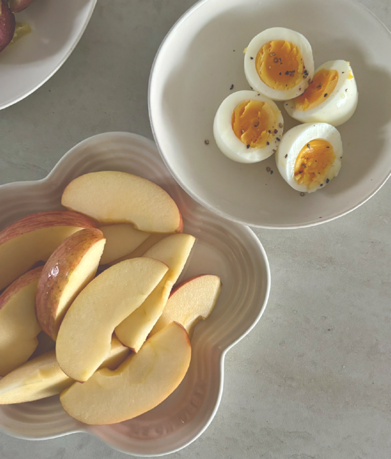 십수 년 간 먹어본 바에 의하면, 삶은 계란과 사과는 아침 메뉴로 좋은 선택이다. 바쁜 아침시간에 빠르게 준비할 수 있고, 영양적으로도 좋다. 단백질과 비타민, 탄수화물을 적절히 먹어줄 수도 있다. 무엇보다 크게 질리지 않는다. 가끔 지겹다며 아빠에게 투정을 부리기도 했었지만, 결국 나 역시도 가장 애용하는 아침메뉴가 되었다. 종종 지겨워지거나 색다른 게 먹고 싶을 땐 약간의 변화를 준다. 요즘 자주 먹는 방법인데, 계란 위에 들기름과 후추를 뿌려주면 더 고급스러운 맛이 난다. 그리고 사과에는 시나몬 가루를 뿌려먹거나, 땅콩버터를 곁들여 먹기도 한다. 사과의 새콤달콤한 맛에 향긋함과 고소함 같은 여러 향이 곁들여진다.