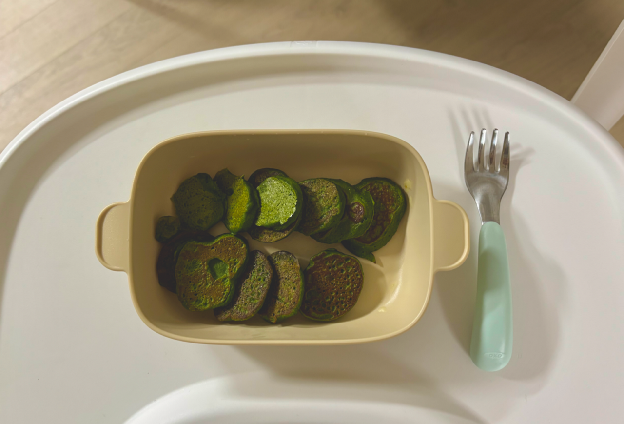 다음 날 아침, 미안한 마음을 담아 아이에게도 달콤한 시간을 선물해 주기로 결심했다. 메뉴는 시금치바나나 팬케이크였다. 바나나는 달콤하고 부드러워 아이가 좋아하는 과일 중 하나이다. 바나나를 큰 조각으로 잘라 믹서기에 넣고, 깨끗이 씻은 시금치도 잘게 잘라 넣었다. 여기에 오트밀 가루와 날계란 한 개를 더해주고, 함께 갈아주면 반죽이 완성된다. 팬에 기름이나 버터를 둘러주고, 반죽을 편평하게 올려 약불에서 구워주면 팬케이크가 완성된다.