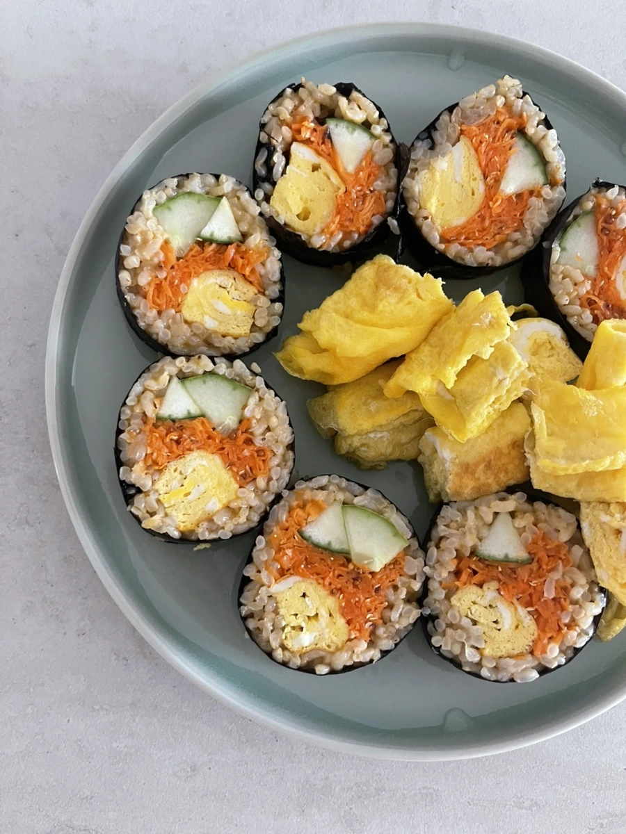 계란을 3개 정도 넉넉히 풀고 소금 한 꼬집을 넣어주었다. 팬에 계란을 두르고 도톰하고 부드러운 계란말이를 만들었다. 그리곤 당근이 한가득 쌓일 정도로 채 썰었다. 기름을 살짝 둘러 볶아주면서 소금 간을 더해 당근의 단맛이 올려주었다. 남아있는 자투리 밥에 참기름을 둘러준 뒤, 깨를 갈아서 고소함을 더했다. 간단하게 속재료 준비를 끝내고 하나씩 차분하게 김밥을 말기 시작했다. 따끈한 밥을 펴고, 도톰한 계란말이 하나, 채 썬 당근을 한가득 올려서 말아주었다. 아이를 위한 작은 사이즈의 김밥도 함께 말아주었다. 김을 네 등분해서 자르고, 재료를 조금씩 올려주니 보기만 해도 귀여워지는 아기 김밥까지 완성되었다.
