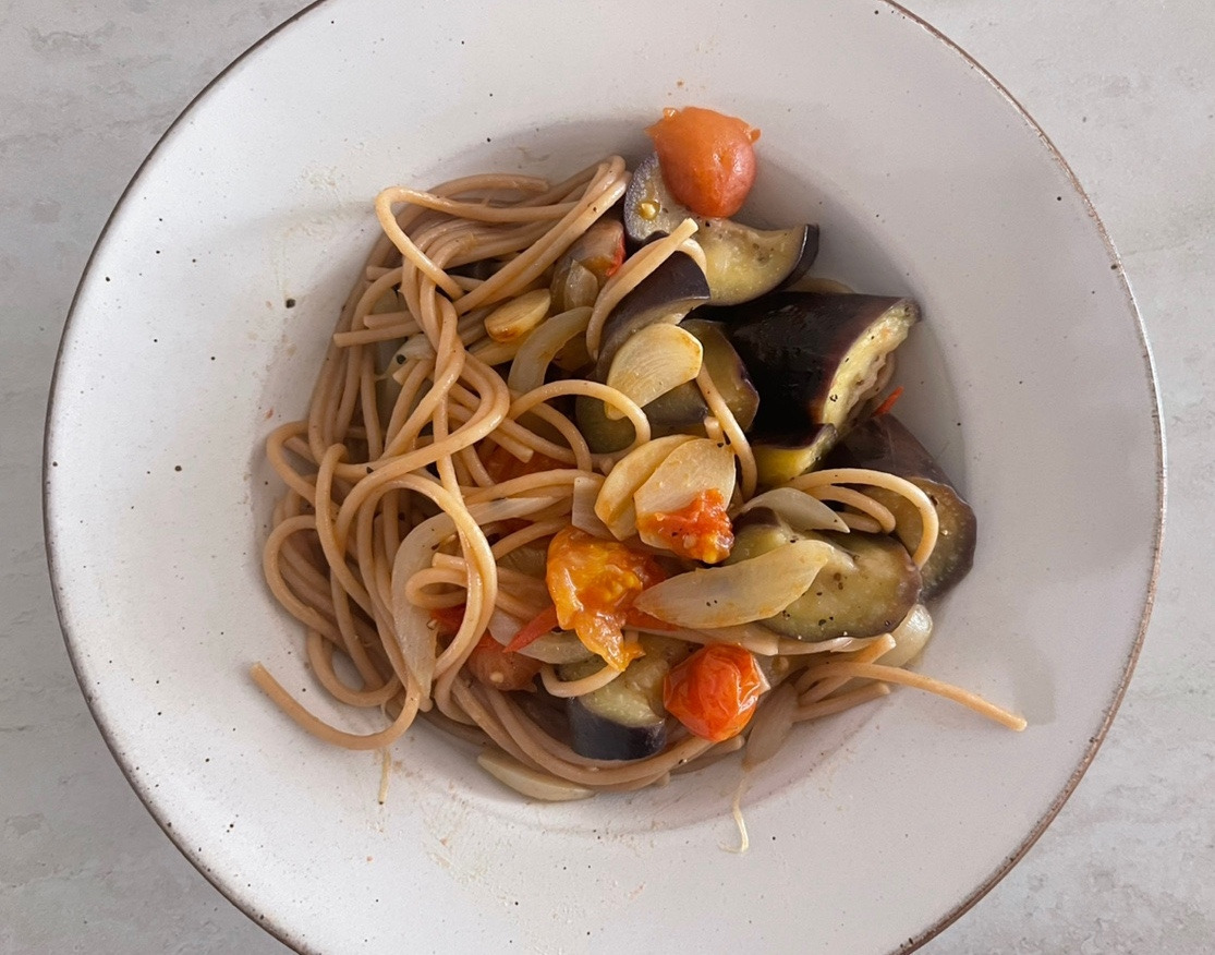 요리를 하는 10분동안 아기는 고맙게도 잘 자주었다. 내가 좋아하는 예쁜 그릇에 담아보고 왠지 기분이 좋아 사진도 남겨봤다. 파스타를 한입 먹는 순간 깔끔하고 담백한 맛이 느껴져 행복했다. 가지의 부드러우면서 쫀득한 식감이 아주 만족스러웠다.