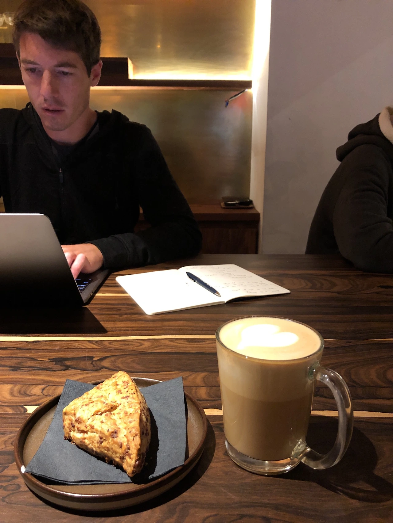 나는 곧장 카운터로 가 스콘과 바닐라라테를 시켰다. 그리고, 각자의 메뉴를 기다리는 공간에 서서 기다렸다. 커피가 나오는 공간이 붐비는 걸로 보아 커피를 테이크 아웃 해가는 사람들도 꽤 많은 모양이었다. 주문과 동시에 바리스타는 즉시 커피를 제조해냈다. 카페는 오픈 주방 형식이라 나는 그 모습을 바로 눈앞에서 지켜볼 수가 있었다. 그 자리에서 뚝딱 라테 아트를 만드는 바리스타의 숙련된 솜씨에 나는 감탄을 표했다.