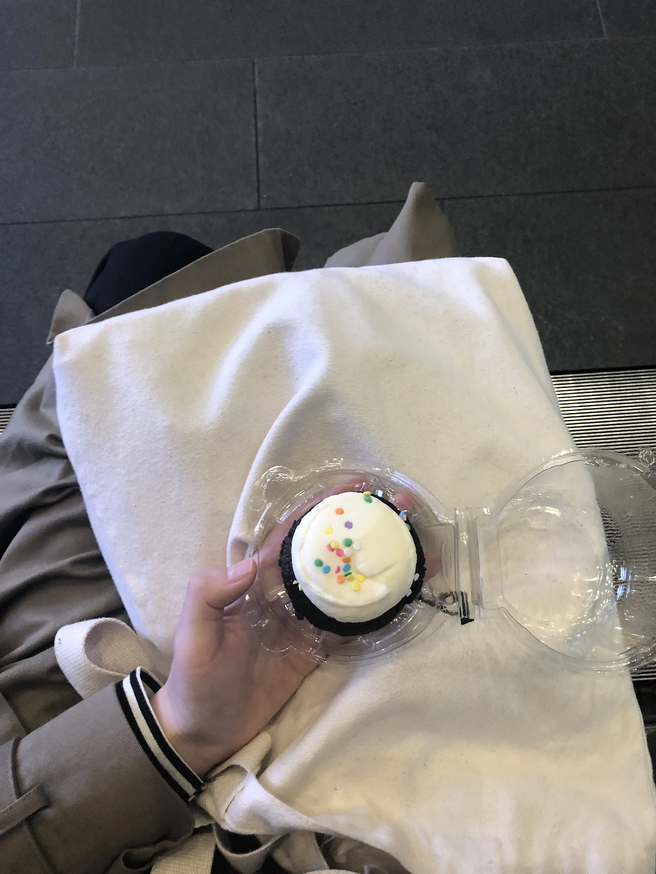 목을 축일 커피도 샀으니 나는 그대로 카페 옆에 있는 컵케잌 가게로 들어가 먹고 싶은 컵케이크를 골랐다. 내가 풀턴 센터에 온 이유였다. 그렇게 왼손엔 컵케잌을, 오른손엔 커피를 든 채 나는 몇몇 사람들이 앉아있는 창가 앞에 엉덩이를 붙였다. 비록 내 마음에 드는 카페를 찾지도 못하고, 비를 맞아 조금 춥기도 했지만 그런대로 나쁘지 않았다. 사실 나는 어떤 것이든 배를 채울만한 무언가가 필요했는지도 모른다.