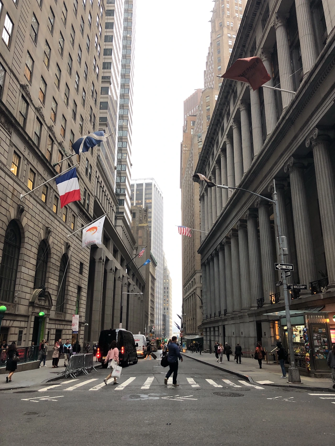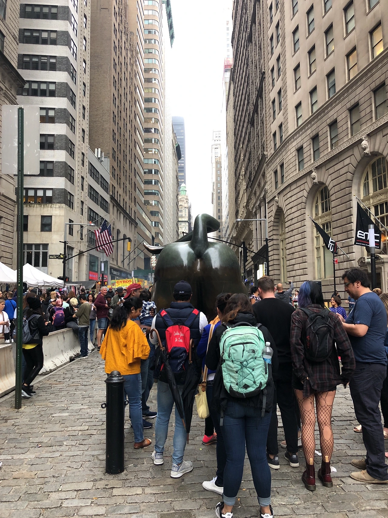 숙소에서 쪽잠을 자고 나오니 몸은 한결 가벼워졌다. 그러나 몸을 감싸고 있는 피로가 완전히 다 해소된 것 같진 않았다. 몽롱함을 떨쳐 내려 노력하면서 나는 월스트릿을 가기로 했다. 지하철 출구를 빠져나오자마자 펼쳐진 거리는 온통 먹거리투성이었다. 각종 푸드 트럭이 즐비한 거리는 맛있는 냄새로 흥건했다. 나를 덮치는 온갖 음식 냄새를 벗어나 나는 돌진하는 황소상 주변을 얼쩡거렸다. 황소상 주변은 이미 많은 사람으로 인산인해였다. 나는 황소상 뒤에 서 있는 줄이 줄어들기를 바라며 별안간 필름카메라를 들고 황소상 주변을 쭈뼛거렸지만, 줄이 줄어들 기미는 전혀 보이지 않았다. 하는 수 없이 나는 마음을 굳게 먹고 황소 뒤에 늘어선 줄에 합류했다. 자기 차례를 기다리는 많은 사람이 지켜보는 가운데 황소의 커다란 엉덩이는 레드카펫의 포토라인 못지않았다. 사람들은 자기 차례가 오면 황소 엉덩이 밑으로 기어들어 가 색이 바랜 중요 부위를 어루만지며 하얀 이를 내보이기 바빴다. 나 또한 기다란 트렌치를 바닥에 질질 끌며 황소 엉덩이 밑으로 들어가 부와 번영을 꿈꾸며, 황소의 두툼한 중요 부위를 매만졌다.